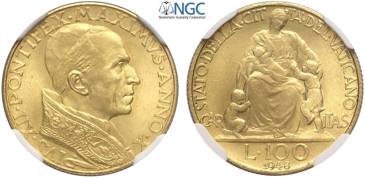 Città del Vaticano, Pio XII (1939-1958), 100 Lire 1948, Rara Au mm 20,7 in Slab NGC MS65