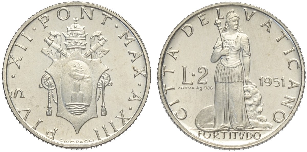 Lotto 116 - Città del Vaticano, Pio XII (1939-1958), 2 Lire 1951 Prova ...