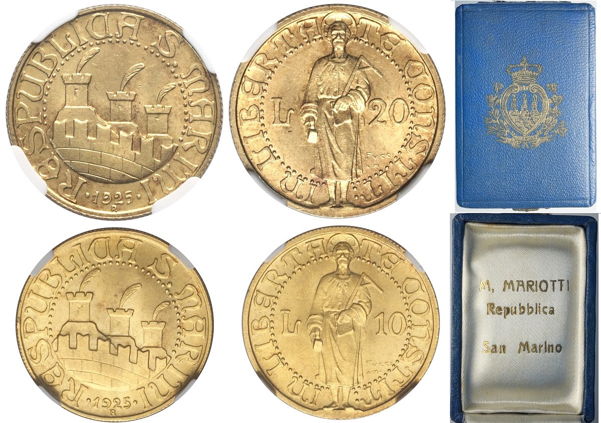 San Marino, Vecchia Monetazione (1864-1938), Mint Set 1925 (2) 20 e 10 Lire, RR Au mm 21 e 19 insieme rarissimo e di alta conservazione, in Slab NGC: 20 Lire MS64; 10 Lire MS66