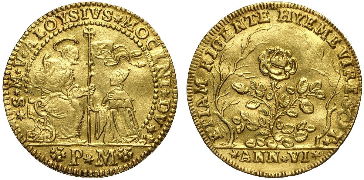 Venezia, Alvise II Mocenigo (1700-1709), Osella da 4 Zecchini 1705-VI, RRRR Au mm 36 g 12,95 proveniente da montatura con contorno restaurato altrimenti SPL