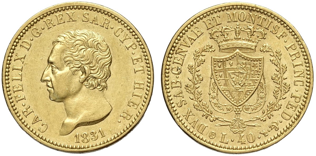 Lotto 146 - Savoia, Carlo Felice (1821-1831), 40 Lire 1831 Torino, Rara ...