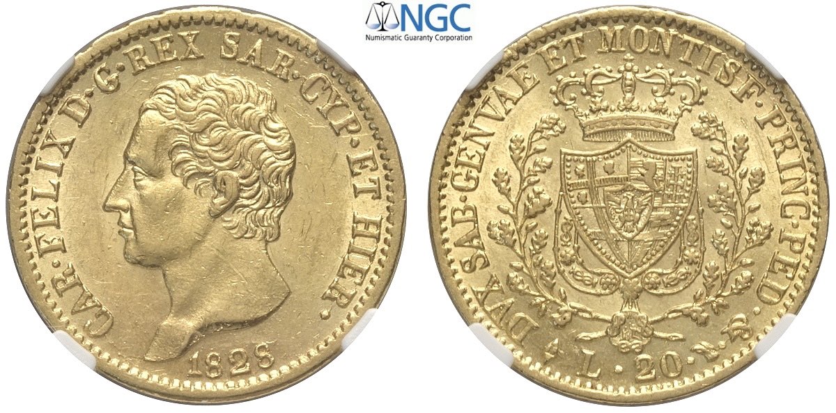 Savoia, Carlo Felice (1821-1831), 20 Lire 1828-L Torino, Au mm 21 di gran conservazione, in Slab NGC MS62