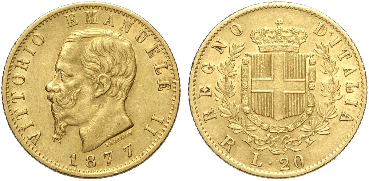 Regno d'Italia, Vittorio Emanuele II (1861-1878), 20 Lire 1877-R Roma, Au mm 21 q.SPL