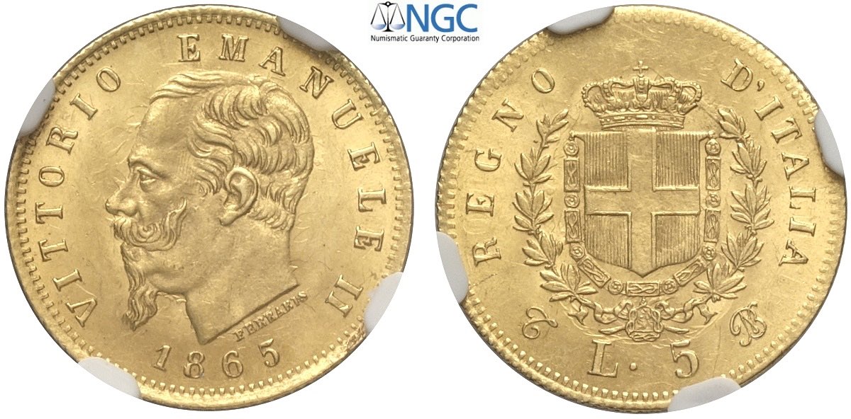 Regno d'Italia, Vittorio Emanuele II (1861-1878), 5 Lire 1865-T Torino, RR Au mm 17 eccelsa conservazione per il tipo, In Slab NGC MS64 (second best grade)