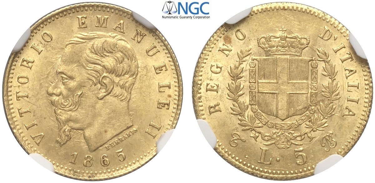 Regno d'Italia, Vittorio Emanuele II (1861-1878), 5 Lire 1865-T Torino, RR Au mm 17 alta conservazione per il tipo, In Slab NGC MS63