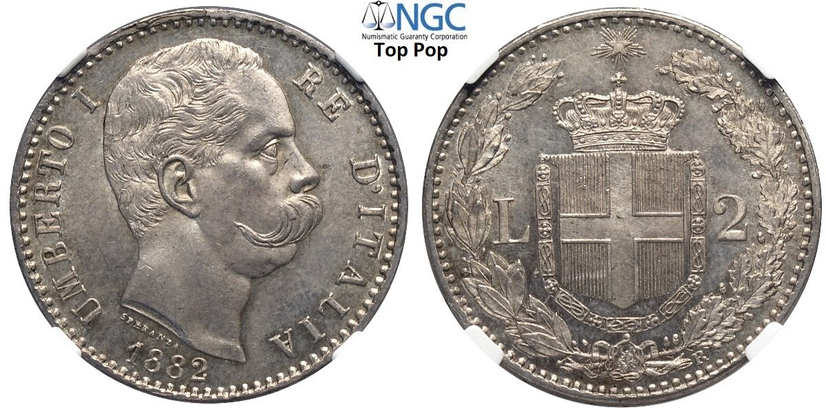 Regno d'Italia, Umberto I (1878-1900), 2 Lire 1882, Ag mm 27 eccezionale, in Slab NGC MS65 (cert. 5782333007 Top Pop!)