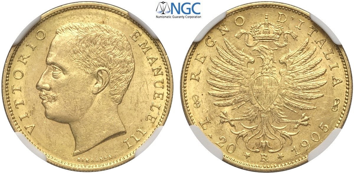 Regno d'Italia, Vittorio Emanuele III (1900-1943), 20 Lire 1905, Rara Au mm 21 in Slab NGC MS63