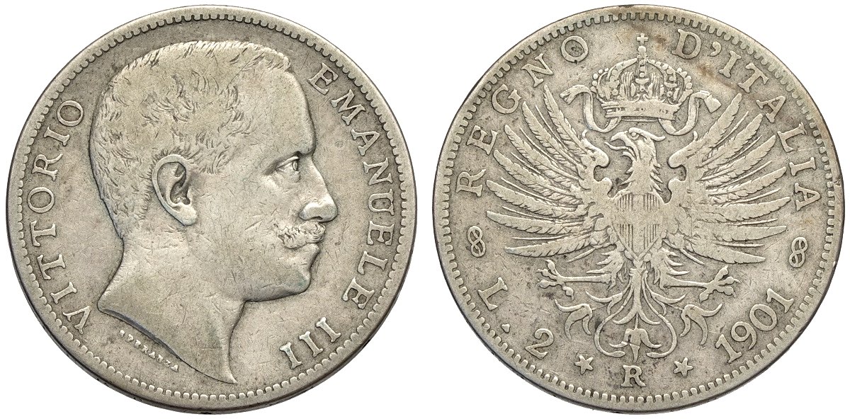 Regno d'Italia, Vittorio Emanuele III (1900-1943), 2 Lire 1901, RR Ag mm 27 MB+