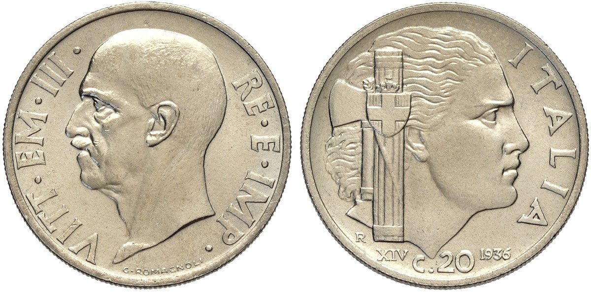 Regno d'Italia, Vittorio Emanuele III (1900-1943), 20 Centesimi 1936, RR Ni mm 21,5 FDC