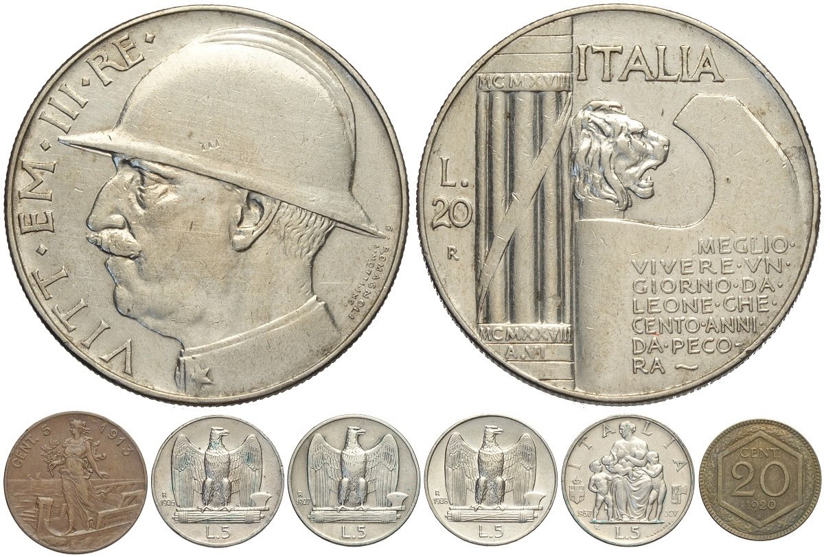 Regno d'Italia, Vittorio Emanuele III (1900-1943), Lotto di 7 Monete differenti, si segnala: 20 Lire 1928 Elmetto (Lucidata) 5 Lire 1928* ... Leggi tutto