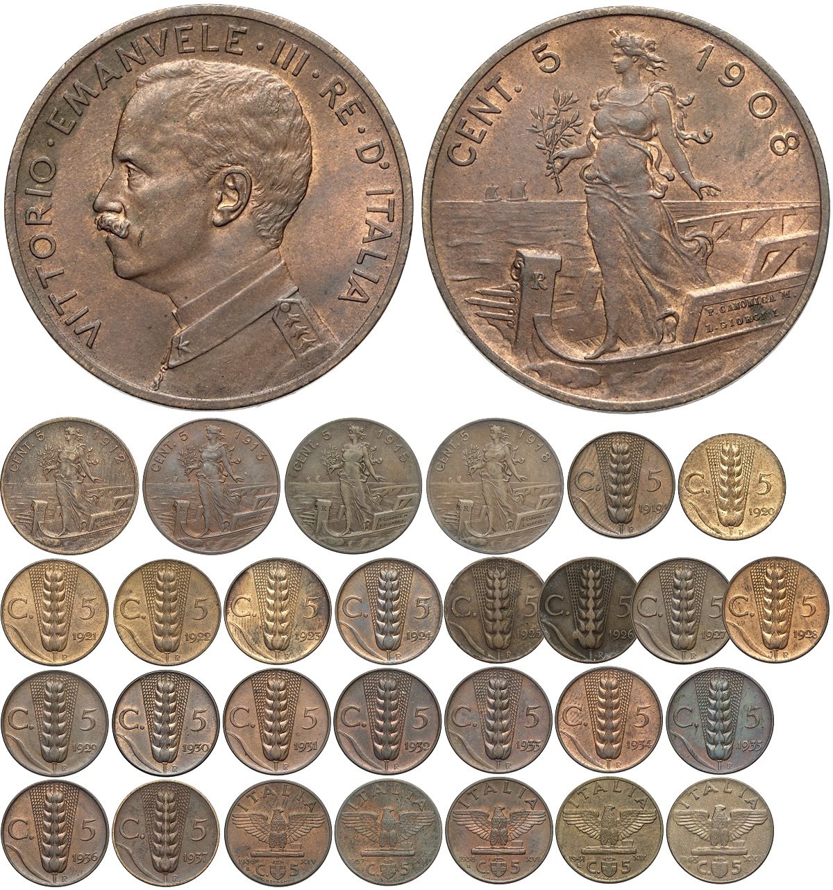Regno d'Italia, Vittorio Emanuele III (1900-1943), Lotto di 29 Monete differenti da 5 Centesimi, si segnala: 1908 (Rara SPL-FDC), 1919 (SPL-FDC), 1937 Spiga (Rara, BB+), 1943 (Rara, SPL-FDC) le restanti di ottima conservazione media