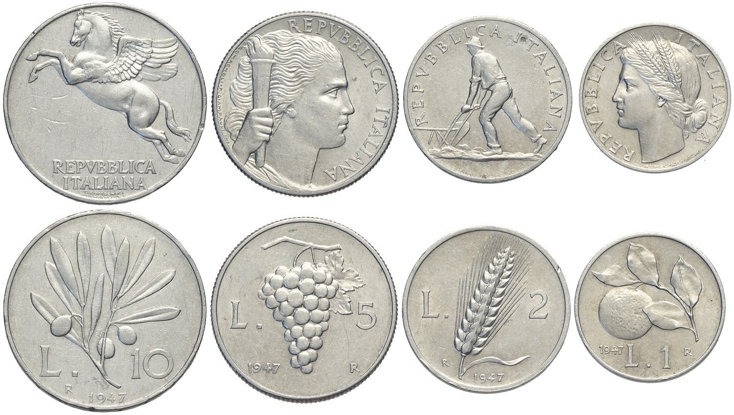 Repubblica Italiana, Monetazione in Lire (1946-2001), Serie 1947. RRR Al, 10 Lire (BB), 5 Lire (BB-SPL), 2 Lire (BB+), Lira (BB-SPL)