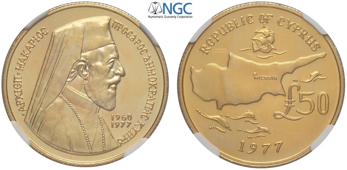 Cyprus, Republic, Archbishop Makarios III (1960-1977), 2 Sovereign (50 Pounds) 1977, Au mm 28,5 g 15,98 in Slab NGC MS66