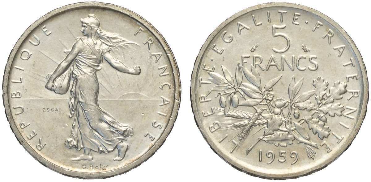 France, Fifth Republic (1959-), Silver Essai 5 Francs 1959, Ag mm 29 g 12,05 q.FDC