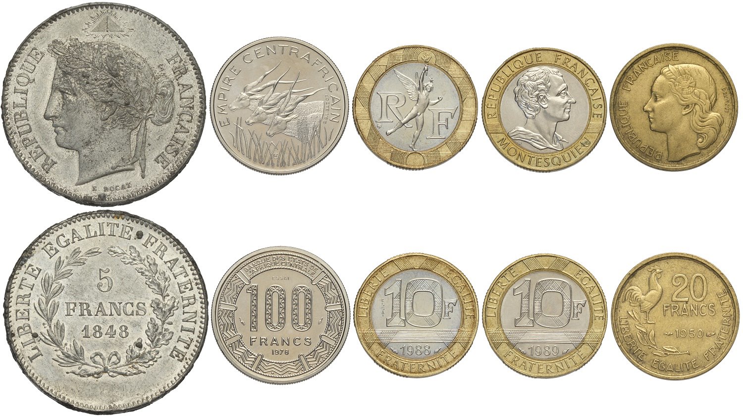 France, Lot of 5 Coins: Tin Pattern 5 Francs 1848 (Maz-1297 SPL); Essai 100 Francs 1978 (Prooflike); Essai 10 Francs 1988 (FDC); Essai 10 Francs 1989 (FDC); 20 Francs 1950 (4 Plumes)