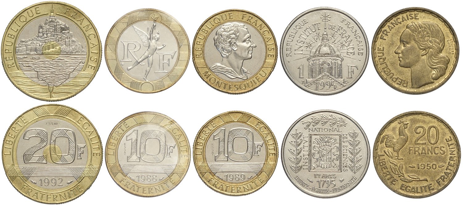 France, Lot of 5 Coins: Essai 20 Francs 1992 (FDC); Essai 100 Francs 1988 (Sealed, FDC); Essai 10 Francs 1989 (FDC); 1 Franc 1995 (SPL); 20 Francs 1950 (3 Plumes)