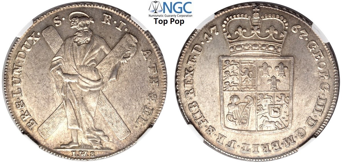 Germany Brunswick-Luneberg-Calenberg-Hannover, George III (1760-1814), Thaler 1767-IWS, KM-343 Dav-2104 Ag mm 41 elevata qualità, in Slab NGC MS64 (cert. 6638567009 Top Pop!)