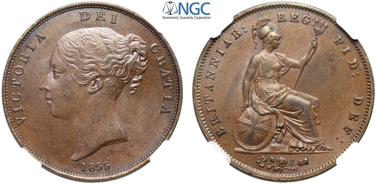 Great Britain, Victoria (1837-1901), Penny 1855 ornamental trident, Cu mm 34 in Slab NGC MS63 BN
