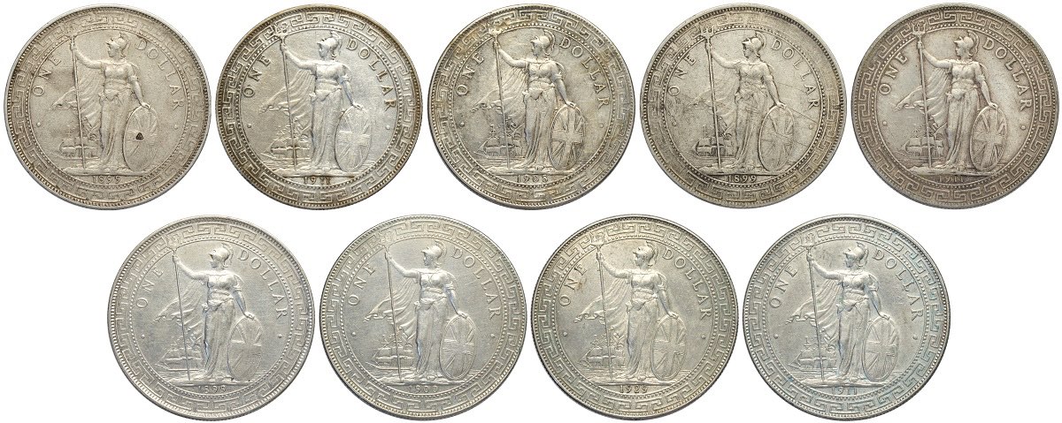 Great Britain, Lot of 9 Trade Dollar: 1899-B (3), 1900-B, 1908-B, 1911-B (3), 1929-B