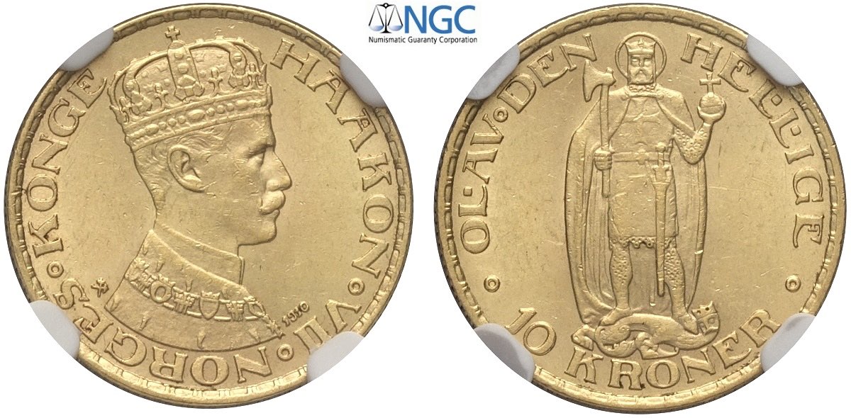 Norway, Haakon VII (1905-1957), 10 Kroner 1910, Au mm 18 in Slab NGC MS62