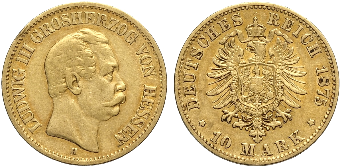 Germany Hesse-Darmstadt, Ludwig III (1848-1877), 10 Mark 1875-H Darmstadt, Au 20 mm , BB