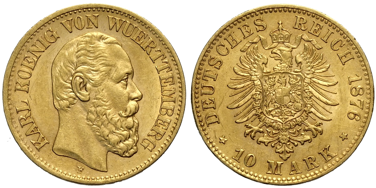 Germany Wurttemberg, Karl I (1864-1891), 10 Mark 1876-F Freudenstadt, Au 20 mm , SPL+