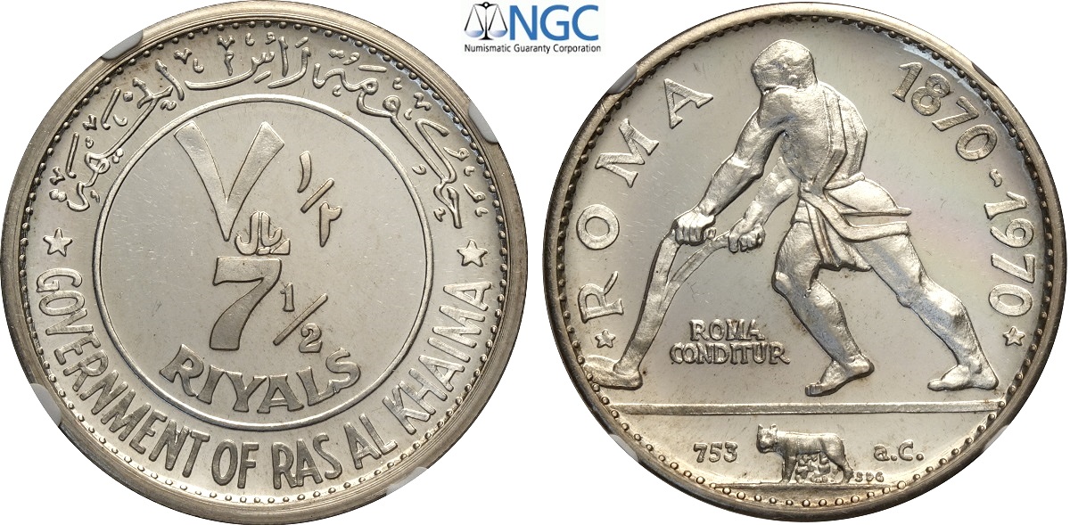 Ras Al-Khaimah, Saqr Bin Muhammad al-Qasimi (1948-), 7,5 Riyals 1970 Roma series, KM-17 Ag 33 mm , in Slab NGC PF67 Ultra Cameo