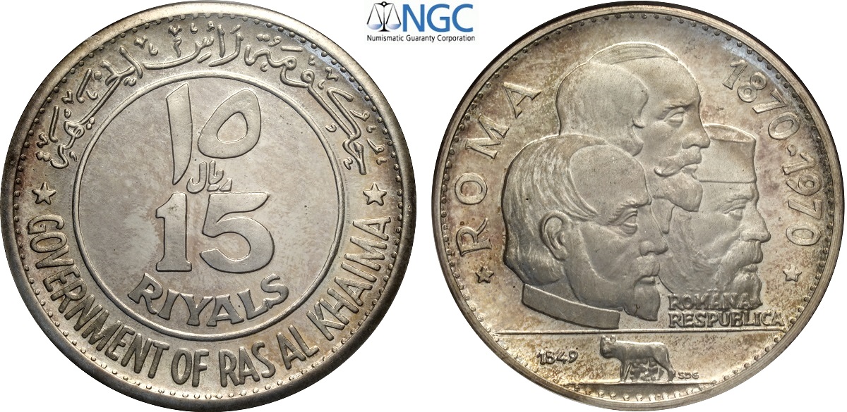 Ras Al-Khaimah, Saqr Bin Muhammad al-Qasimi (1948-), 15 Riyals 1970 Roma series, KM-19 Ag 44 mm , in Slab NGC PF66 Ultra Cameo
