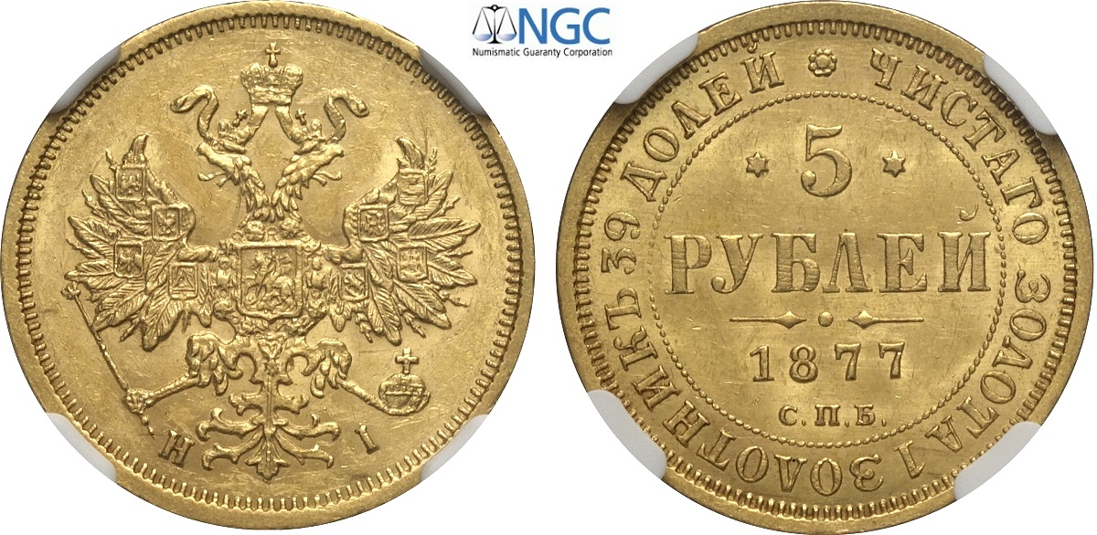 Russia, Alexander II (1855-1881), 5 Roubles 1877-HI, Au 22,5 mm , in Slab NGC MS61