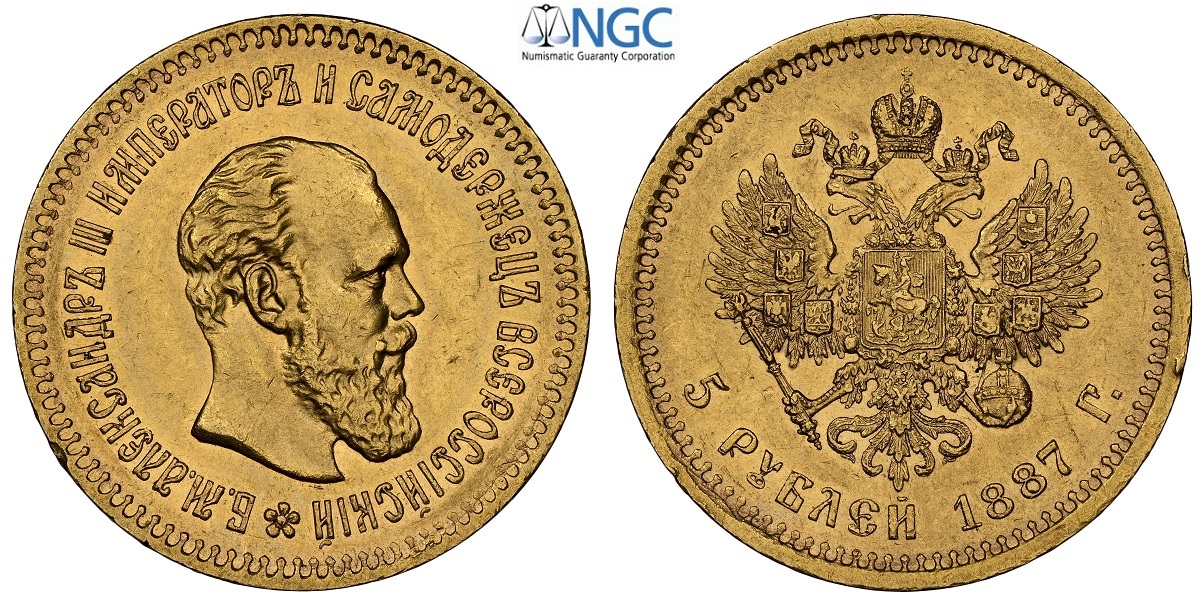 Russia, Alexander III (1881-1894), 5 Roubles 1887, Au 21,5 mm , in Slab NGC AU58