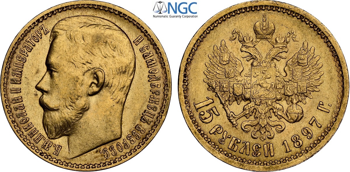 Russia, Nicholas II (1894-1917), 15 Roubles 1897 Narrow rim, Au 24,5 mm 12,90 g , in Slab NGC MS61