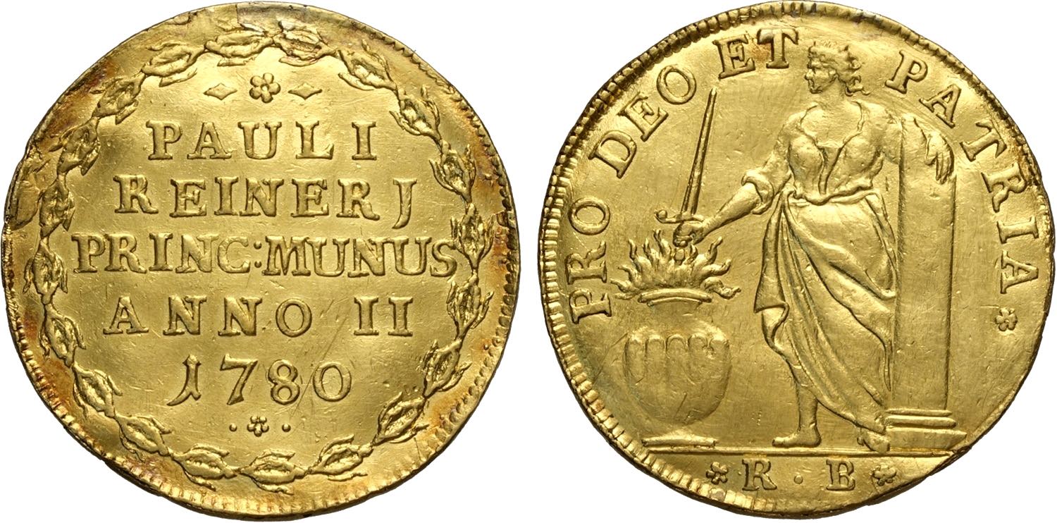 Venezia, Paolo Renier (1779-1789), Osella in oro da 4 Zecchini 1780-II, RRR Au 33 mm 13,70 g, traccia di appiccagnolo altrimenti q.SPL