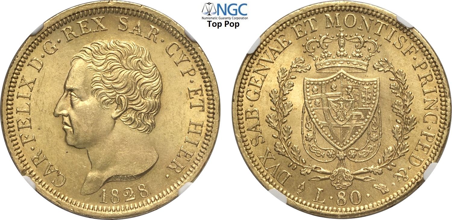 Savoia, Carlo Felice (1821-1831), 80 Lire 1828-L Torino, Au 33 mm 25,80 g, conservazione eccezionale per questo millesimo, in Slab NGC MS63 Top Pop! (cert. 6643292009)
