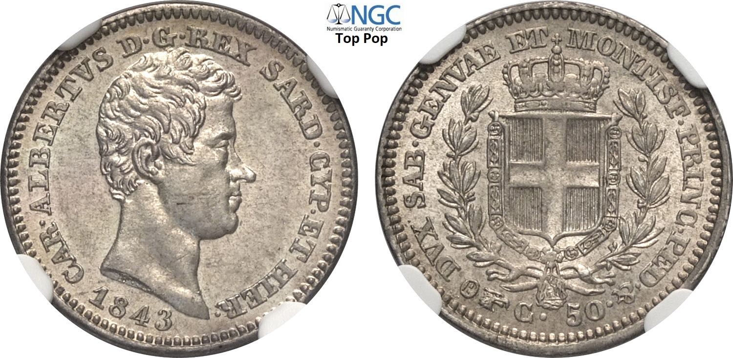 Savoia, Carlo Alberto (1831-1849), 50 Centesimi 1843 Torino, RR Ag 18 mm 2,5 g, di qualità eccezionale con fondi lucenti, in Slab NGC MS66 Top Pop! (cert. 6771632018)