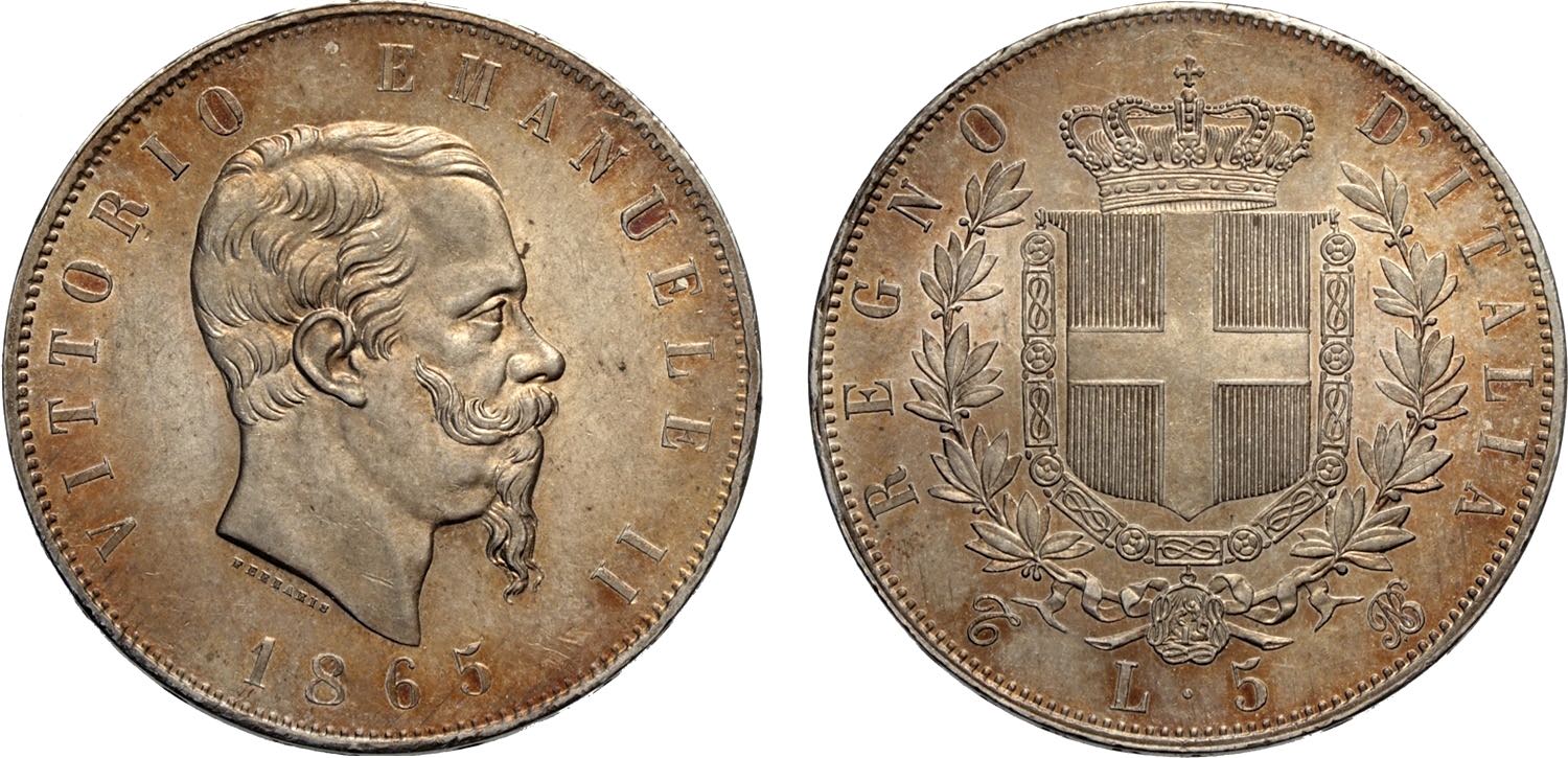 Regno d'Italia, Vittorio Emanuele II (1861-1878), 5 Lire 1865 Torino, Rara Ag 37 mm 25 g, alta conservazione, SPL-FDC