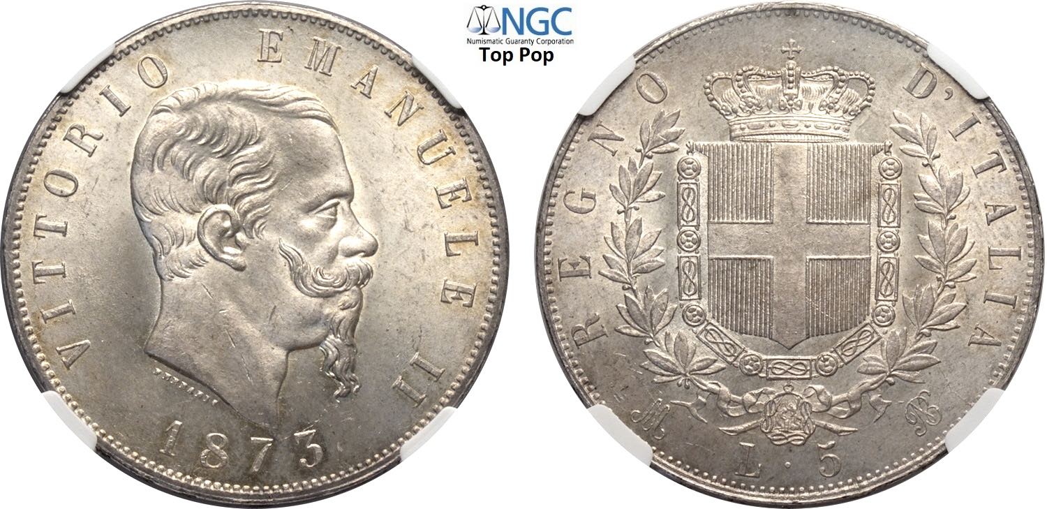 Regno d'Italia, Vittorio Emanuele II (1861-1878), 5 Lire 1873 Milano, Ag 37 mm 25 g, di eccezionale qualità, in Slab NGC MS65 Top Pop! (cert. 5788928005)