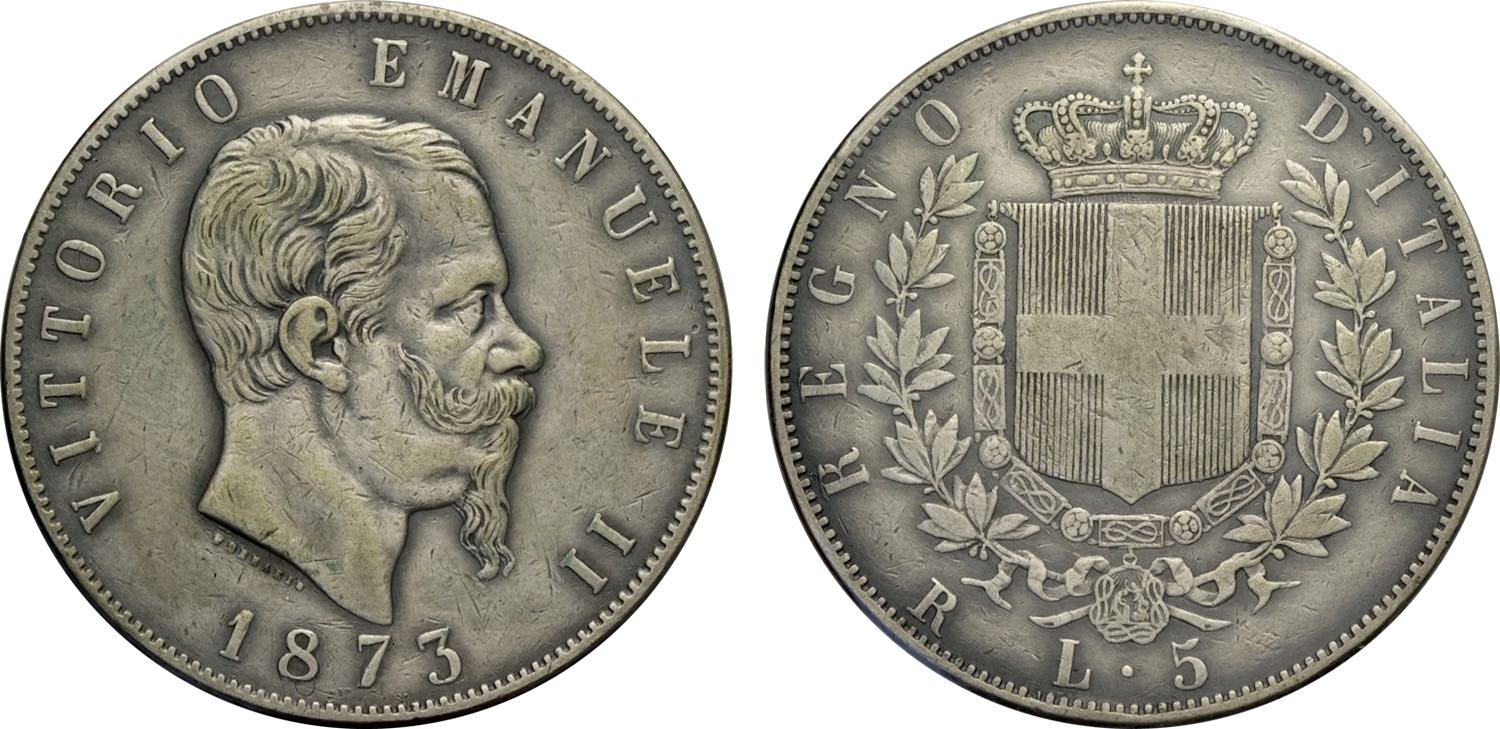 Regno d'Italia, Vittorio Emanuele II (1861-1878), 5 Lire 1873 Roma, RRR Ag 37 mm 25 g, sigillata da C. Varesi, ritocchi al bulino