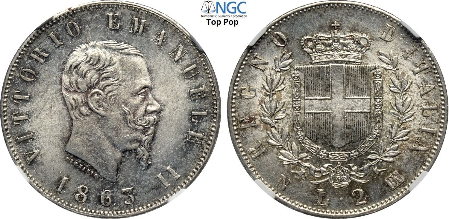 Regno d'Italia, Vittorio Emanuele II (1861-1878), 2 Lire 1863 Napoli "stemma", Ag 27 mm 10 g, di impareggiabile qualità, ex asta NAC 129 del 2021 collezione ANPB, in Slab NGC MS67 Top Pop! (cert. 5782310015)