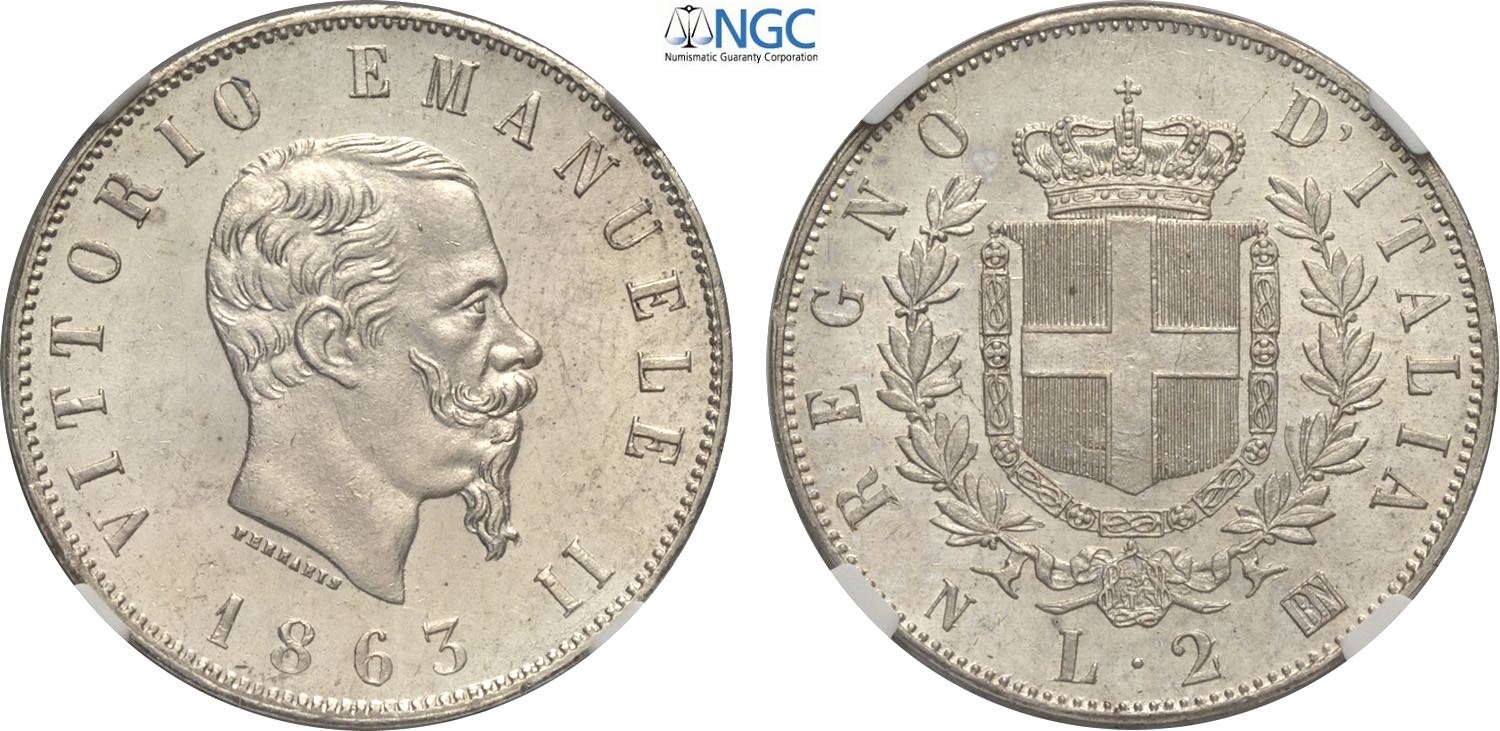Regno d'Italia, Vittorio Emanuele II (1861-1878), 2 Lire 1863 Napoli "stemma", Ag 27 mm 10 g, in Slab NGC MS63
