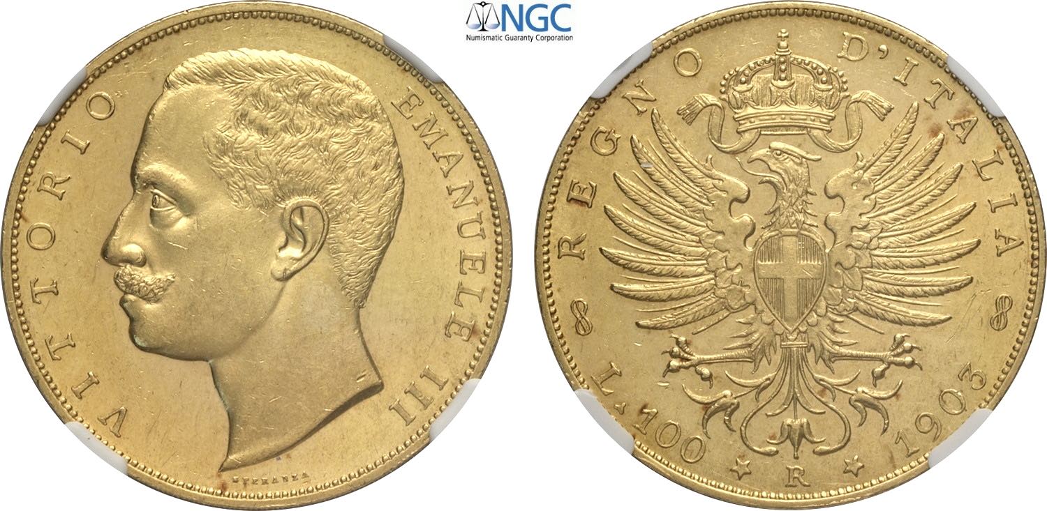 Regno d'Italia, Vittorio Emanuele III (1900-1943), 100 Lire 1903, RR Au 35 mm, qualità superiore alla media, in Slab NGC MS62