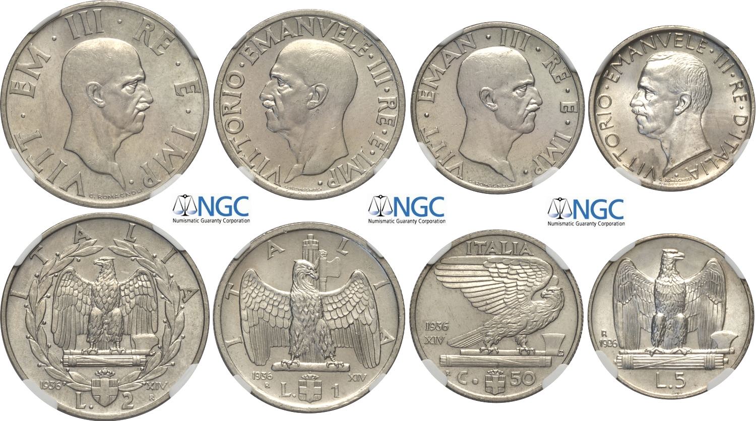 Regno d'Italia, Vittorio Emanuele III (1900-1943), Lotto di 4 monete rare in Slab NGC: 5 Lire 1926 (MS63), 2 Lire 1936 (AU58), Lira 1936 (MS62), 50 Centesimi 1936 (MS64)