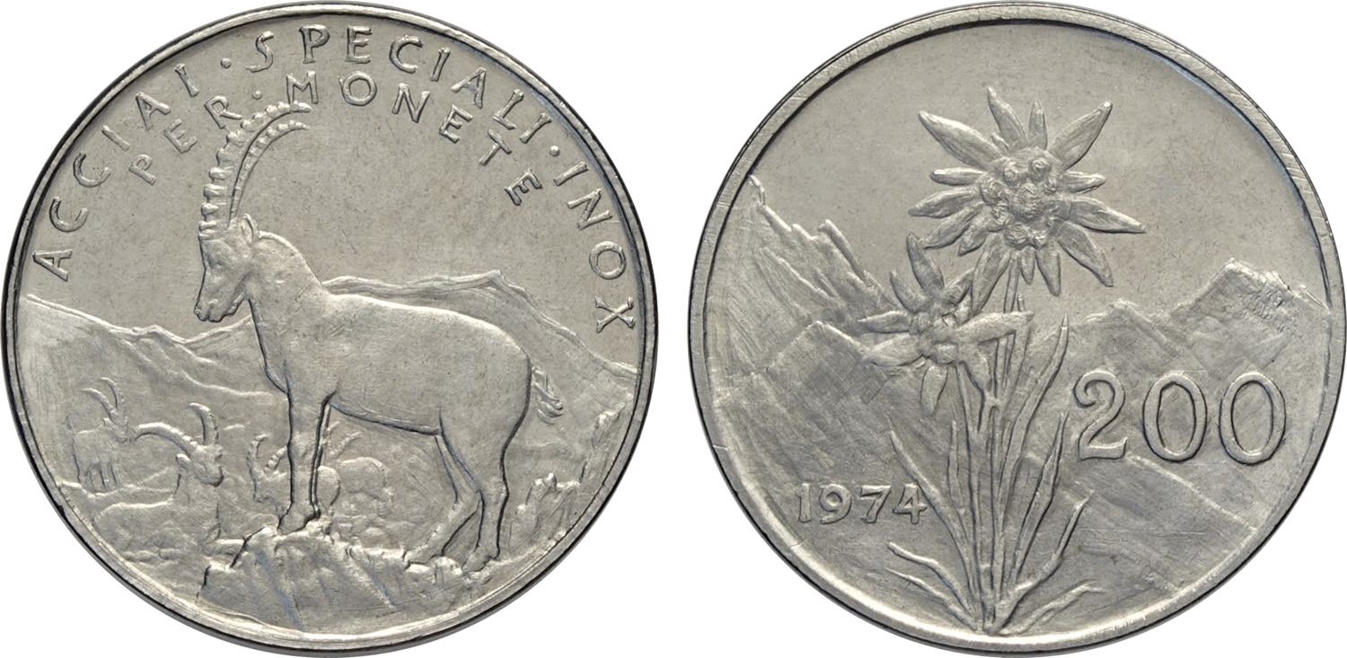 Repubblica Italiana, Monetazione in Lire (1946-2001), Progetto da 200 Lire 1974, contorno liscio, Acciai speciali inox per monete, Ac 25 mm 6,03 g. FDC