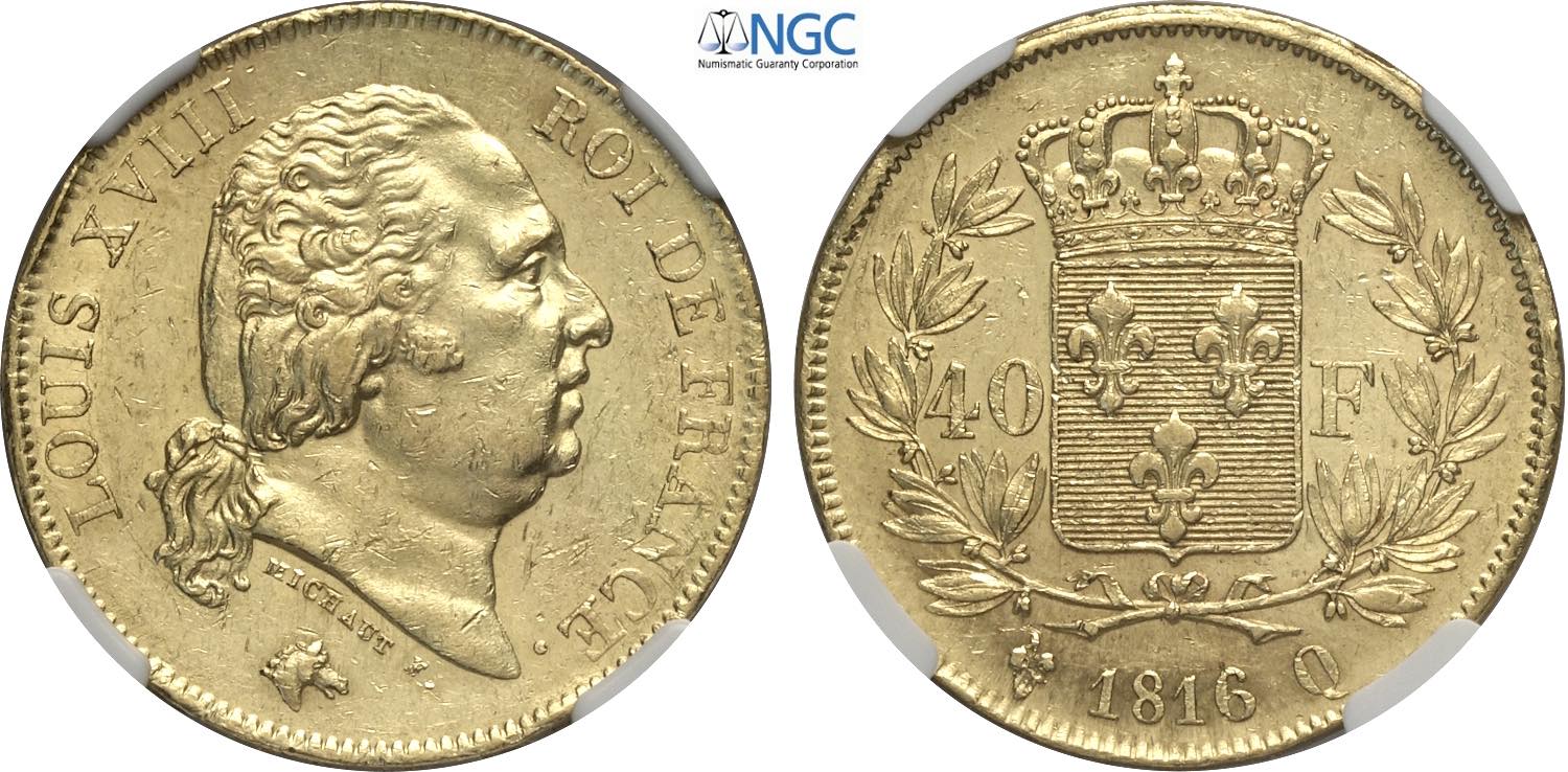 France, Louis XVIII (1814-1824), 40 Francs 1816-Q, Perpignan mint, Au 26 mm, 12,9 g, in Slab NGC MS60 (only 1 coin is graded higher)