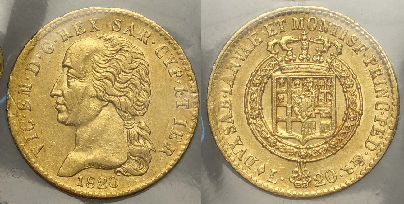 Savoia - Vittorio Emanuele I - 20 Lire 1820 - Rara AU mm 21 - sigillata SPL51 da E. Montenegro