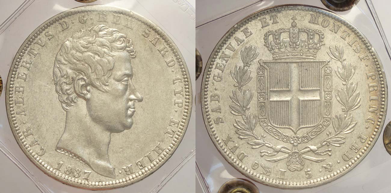 Savoia, Carlo Alberto, 5 Lire 1837 Genova, Ag mm 37 sigillata SPL da E. Ranieri