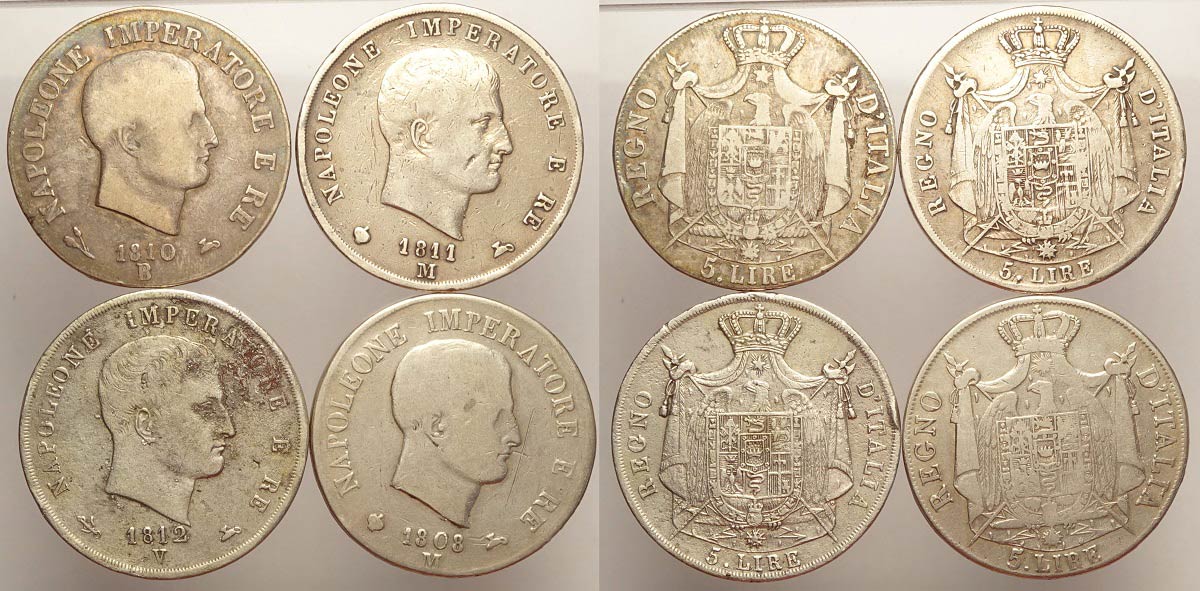 Napoleone I Re d'Italia, lotto di 4 monete da 5 Lire Ag: 1808-M; 1810-B Rara; 1811-M; 1812-V Rara