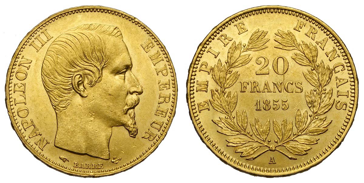 France, Napoleon III, 20 Francs 1855-A, Au mm 21 SPL-FDC