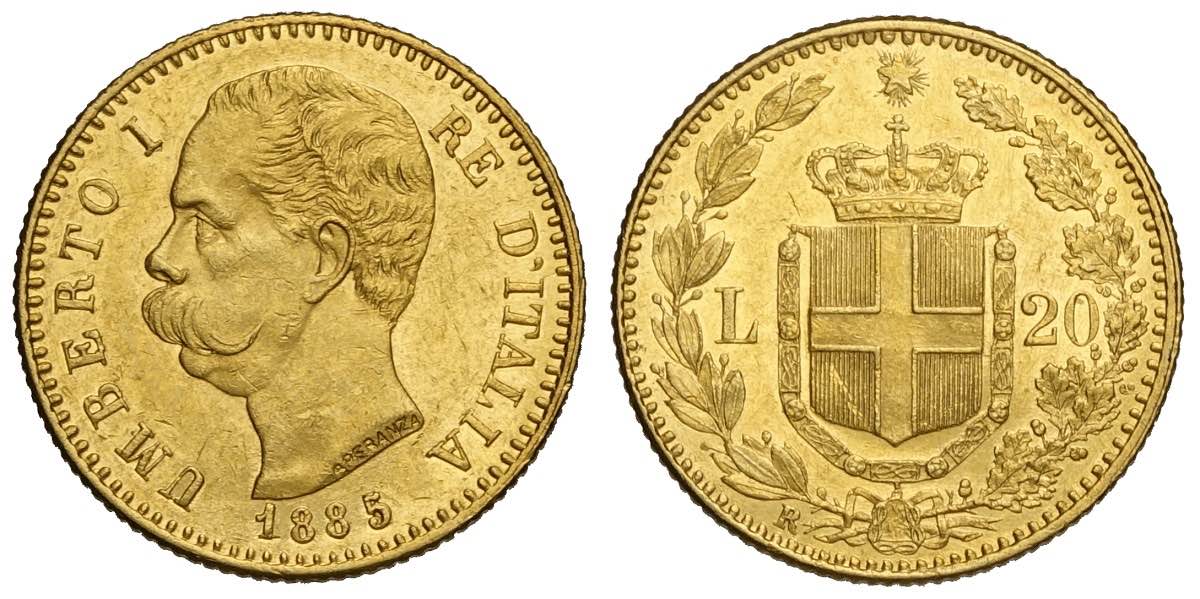 Regno d'Italia, Umberto I, 20 Lire 1885, Au mm 21 SPL