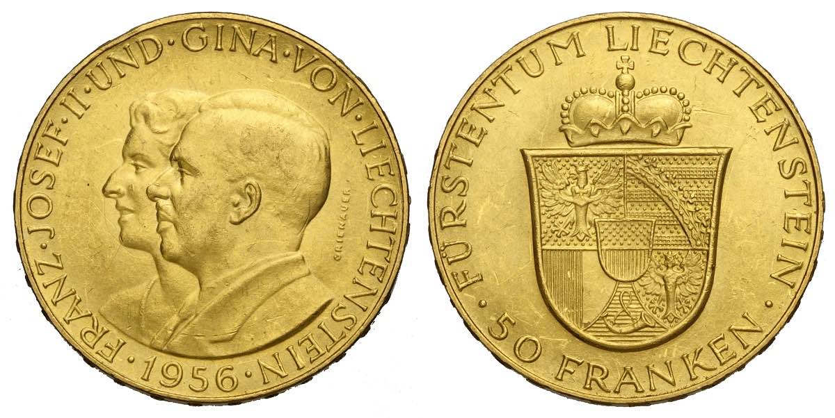 Lotto 389 - Liechtenstein, Franz Joseph II, 50 Franken 1956, Au 900 g ...