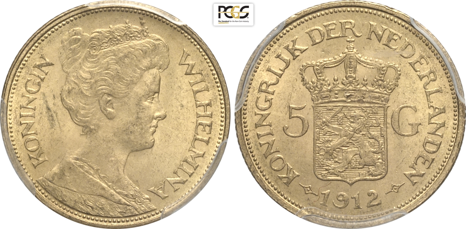 Netherlands, Wilhelmina I (1890-1948), 5 Gulden 1912, Utrecht mint, Au 18 mm, 3,36 g, in Slab PCGS MS63